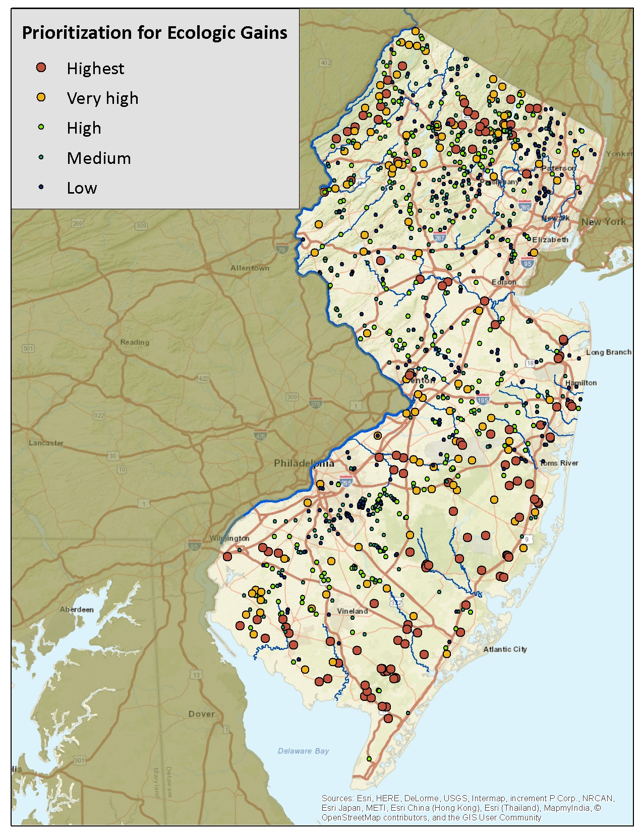 The Northeast Aquatic Connectivity Assessment was conducted to prioritize dams across the Northeast and identify those with the highest potential ecologic gains if removed. Dams were ranked according to a number of factors that would indicate the potential for improved stream health, especially for migratory fish species. Factors included the number of river miles reconnected, the portion of the floodplain that is undeveloped, and the presence of migratory fish found below the dam. This particular map shows dams prioritized by ecological factors only and does not consider other issues such as public safety, flooding or condition of the structure.
